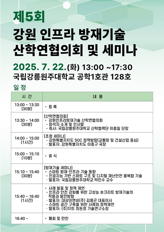 2025 5회 강원 인프라 방재기술을 위한 산학연협의회 및 세미나를 722() 국립강릉원주대학교 공학1호관 128호에서 진행하였습니다.