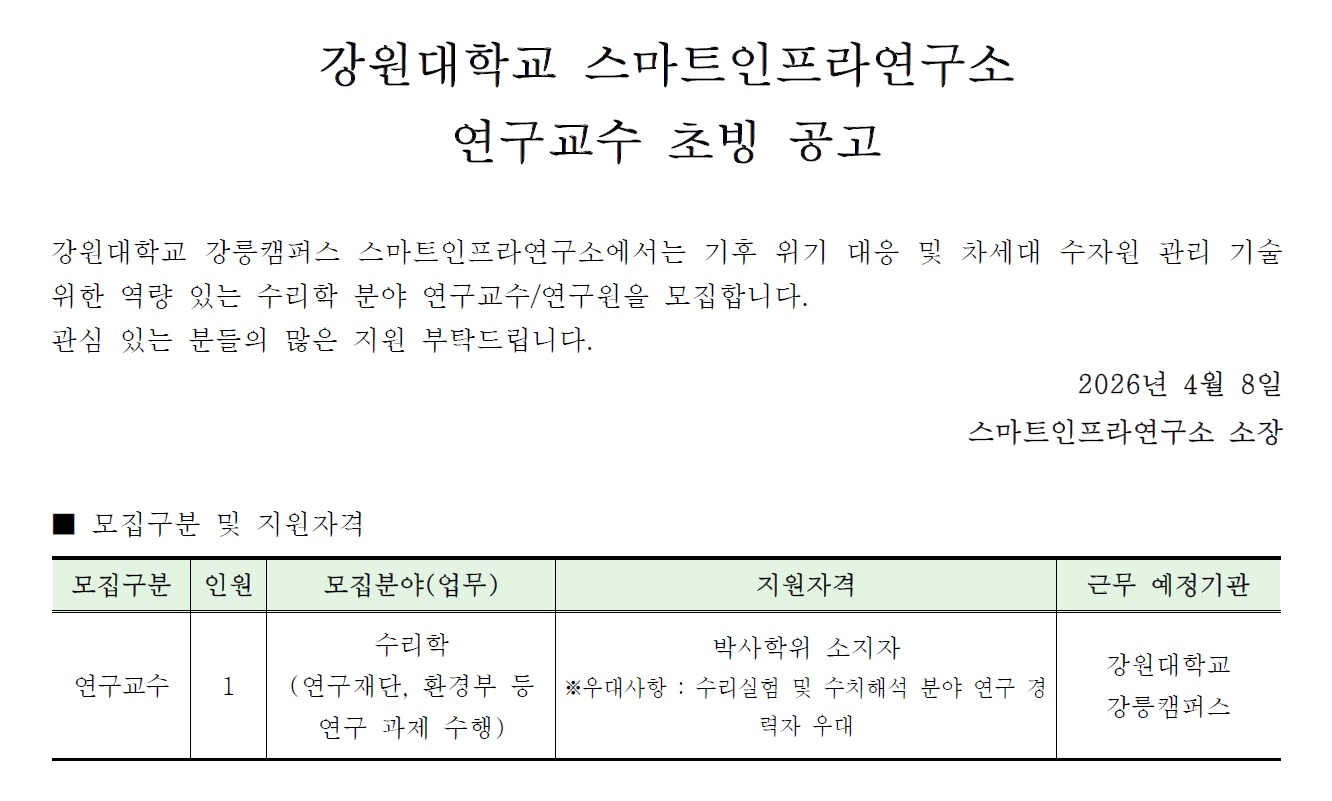 강원대학교 스마트인프라연구소 연구교수 채용 공고